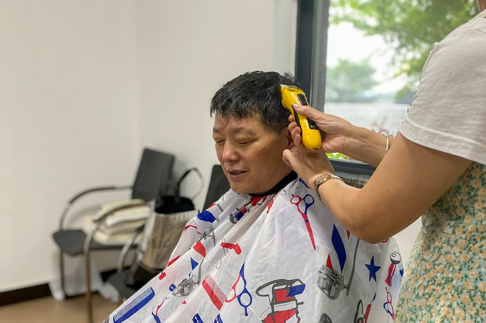6月18日中午,公司邀請的兩位理發師來到了活動地點,貼心地詢問這些父親們對自己發型的要求,憑借嫻熟的技藝,為他們修剪出了滿意的發型。沒有花哨時尚的造型,理發師卻“剪”出了大家的笑容,同時也“剪”出了中達新材對員工們深切的關愛。